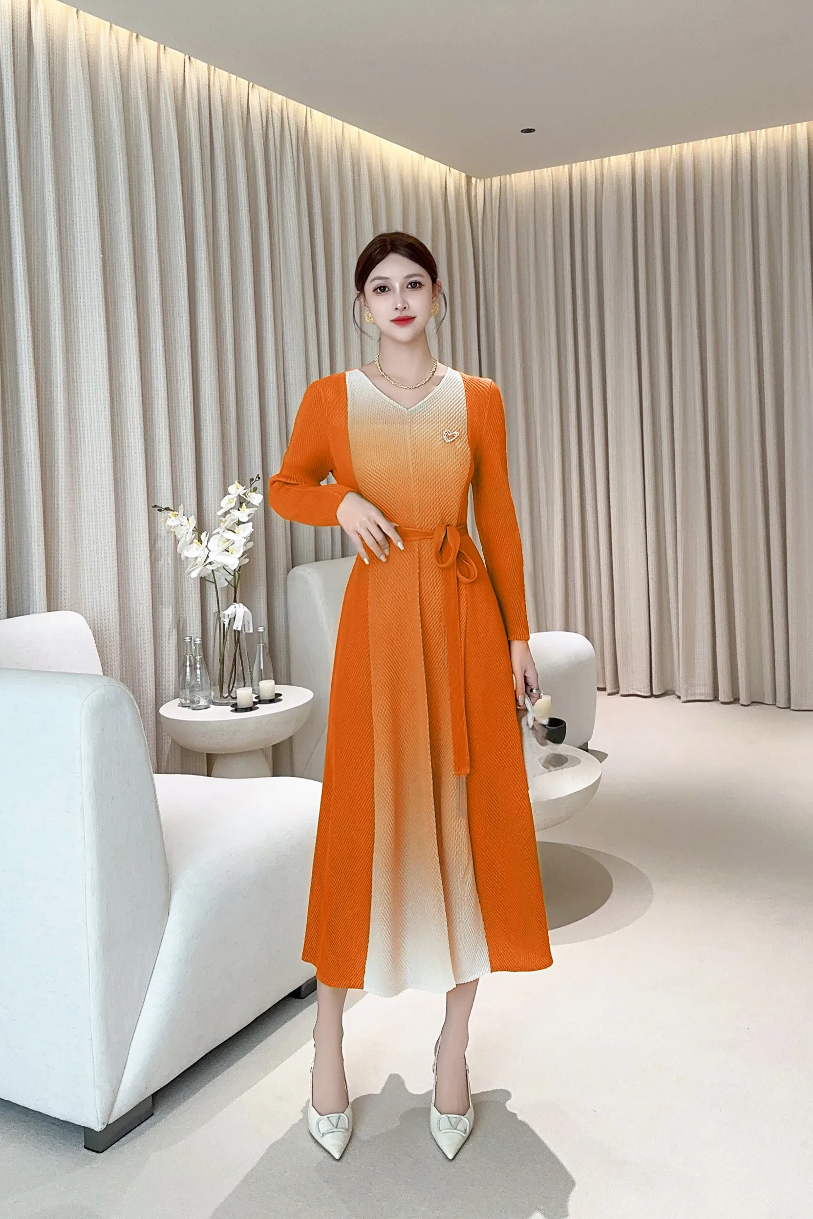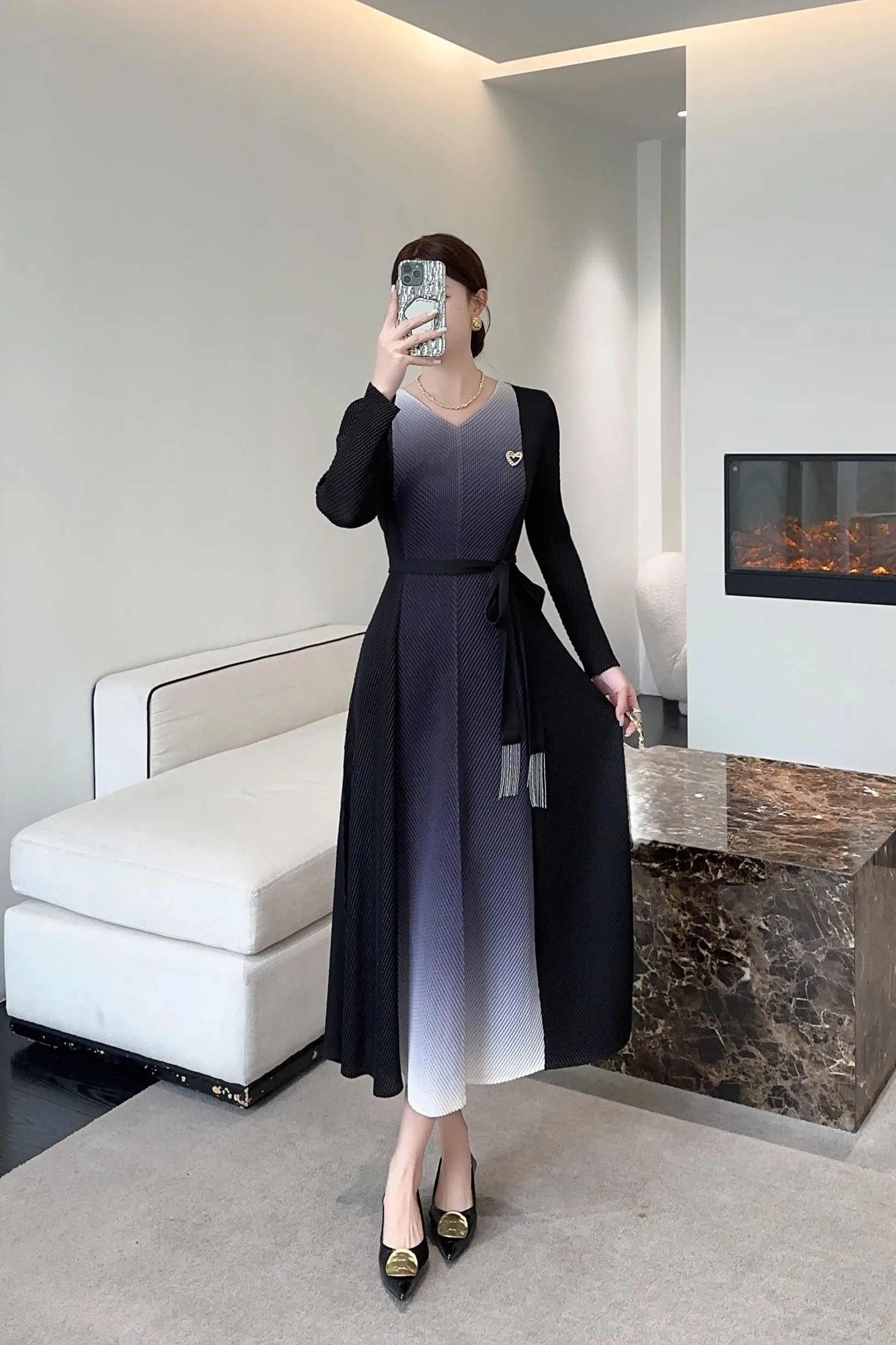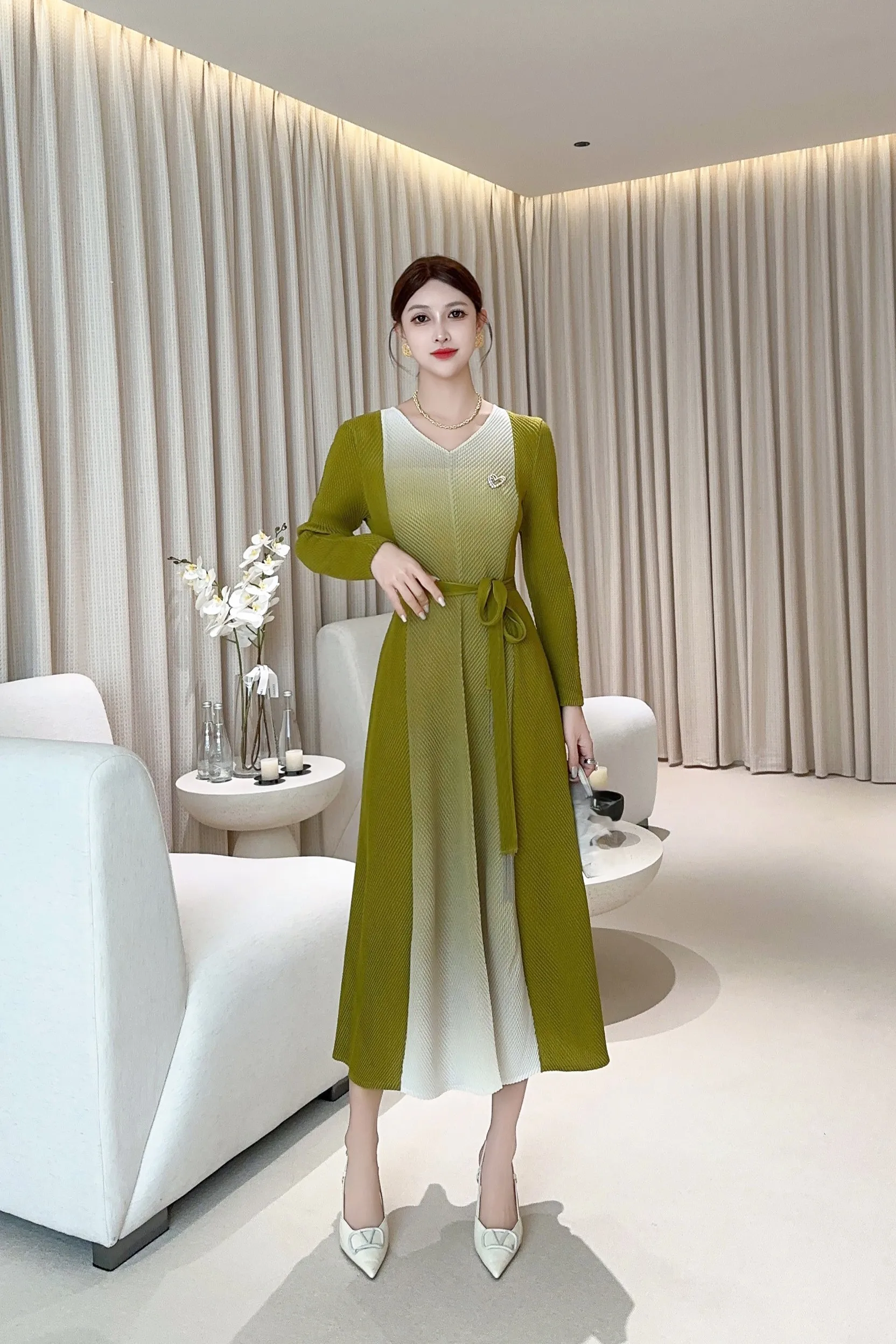 Elegant Gradient-colored Long Dress with Loose V-neck and High-end Pleated Dress